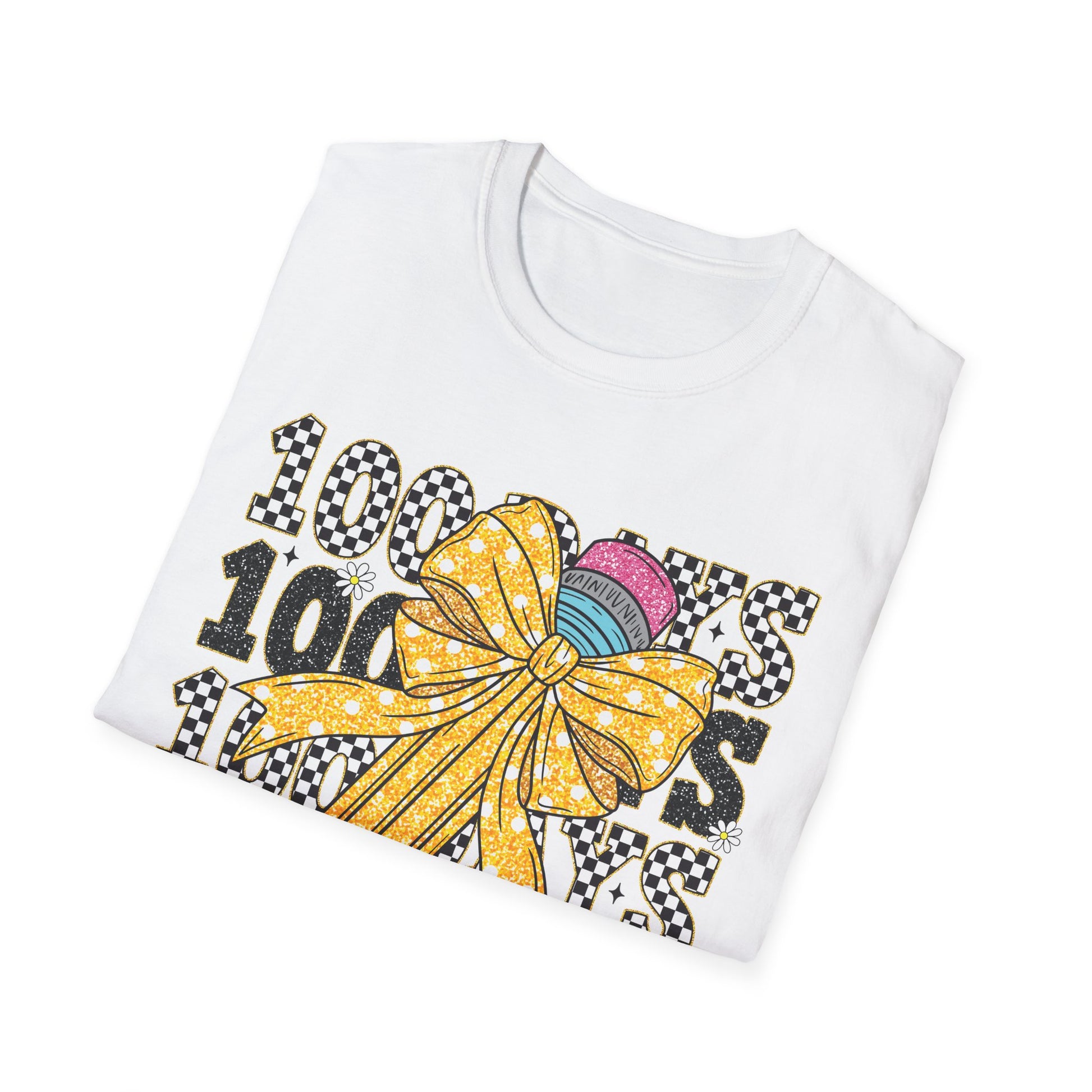 Celebrate the 100th day of school with this soft, breathable tee that feels like a quiet high-five from the classroom. The design layers playful typography with a cheerful, hand-drawn yellow bow and school supplies—bright, slightly whimsical, and full of small joyful details that kids and teachers notice. Wear it on classroom count-downs, school events, or casual picture days to bring a light, festive energy without shouting for attention. The crew neck and clean silhouette tuck easily into jeans or skirts, while the lightweight cotton keeps kids comfortable through assemblies, art time, and the walk home.