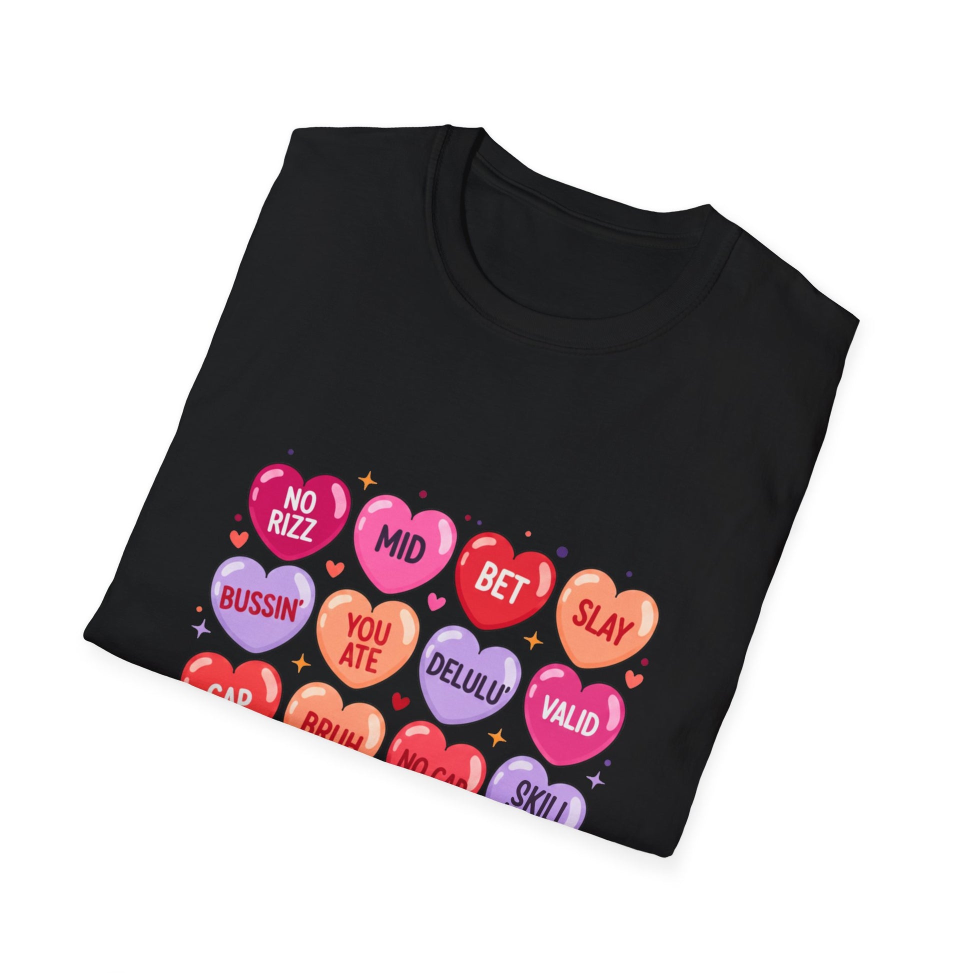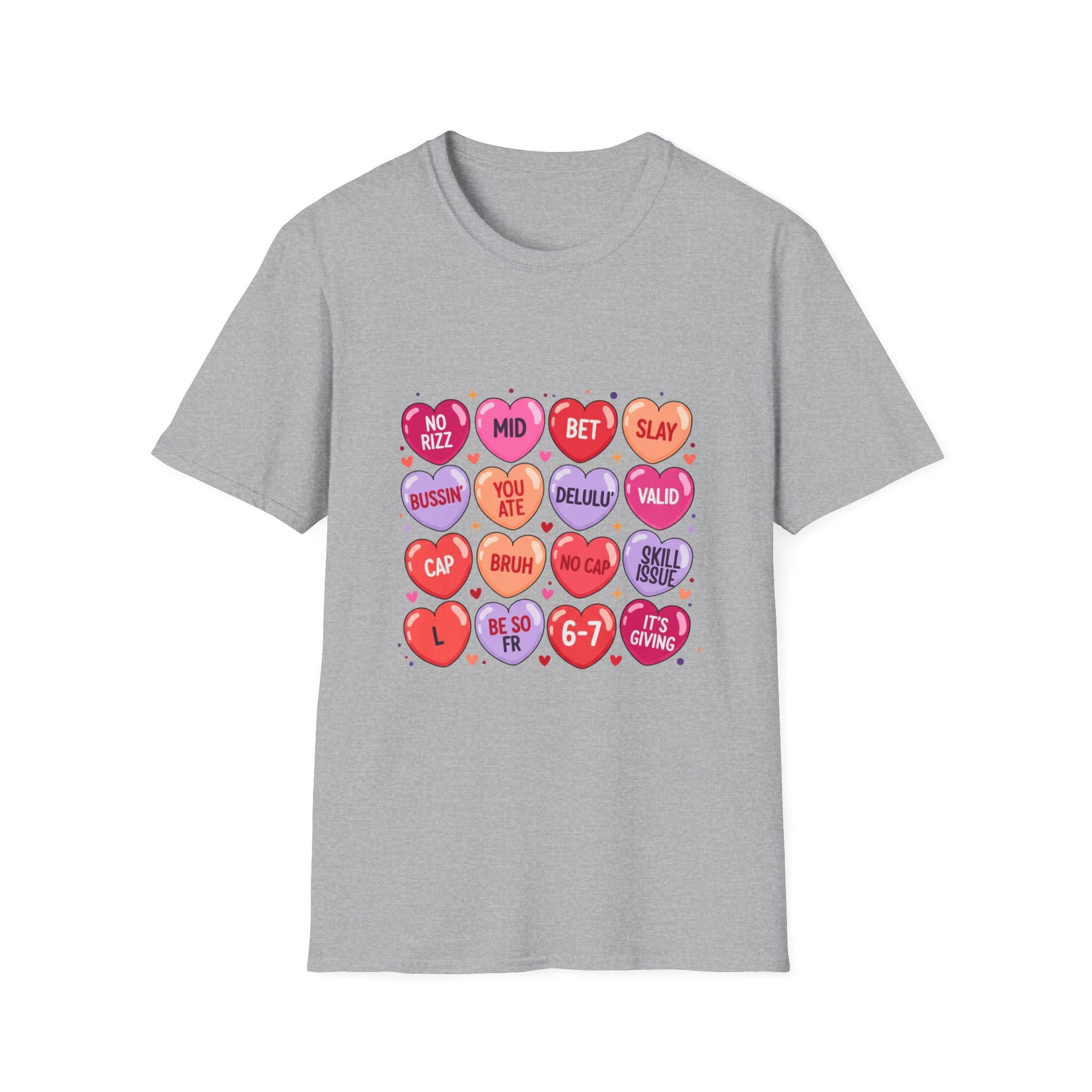 This lightweight cotton tee brings playful attitude to everyday wear with a quirky grid of candy-heart graphics and cheeky short phrases. Soft, smooth ring-spun cotton sits close to the skin and keeps the printed colors vivid and crisp. Wear it layered under a jacket or solo on warmer days — the familiar crew neckline and classic cut keep the look casual and confident. It feels lived-in from the first wear but built to last: strong seams, a ribbed collar that holds its shape, and tear-away label for comfort. The design reads like a wink across the chest, turning a simple shirt into a conversation starter for nights out, meetups with friends, or relaxed weekend plans.